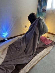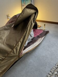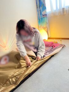 - マットに入る際は、紙シーツの上に横になり、バスタオルをかけ、専用カバーをかけてジッパーをしめます。(寝袋に入るような感じです)